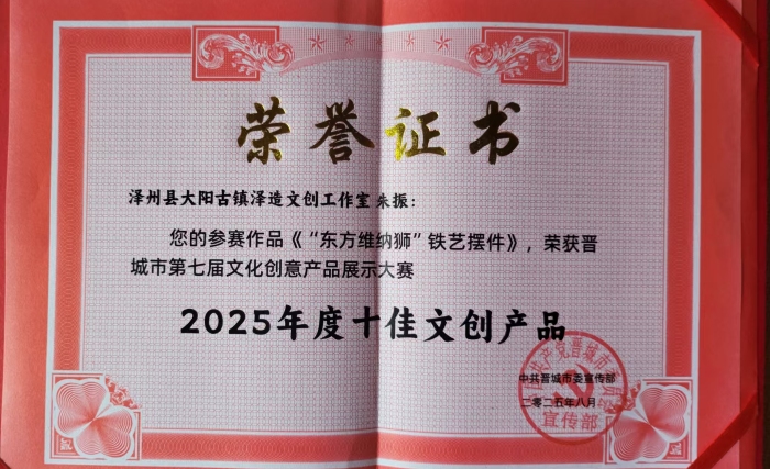 凭借这件作品,朱振在本次文博会上荣获“2025年山西文博会晋城十佳文创奖”,他的创新实践和非遗活化成果获得了专家与观众的广泛认可。