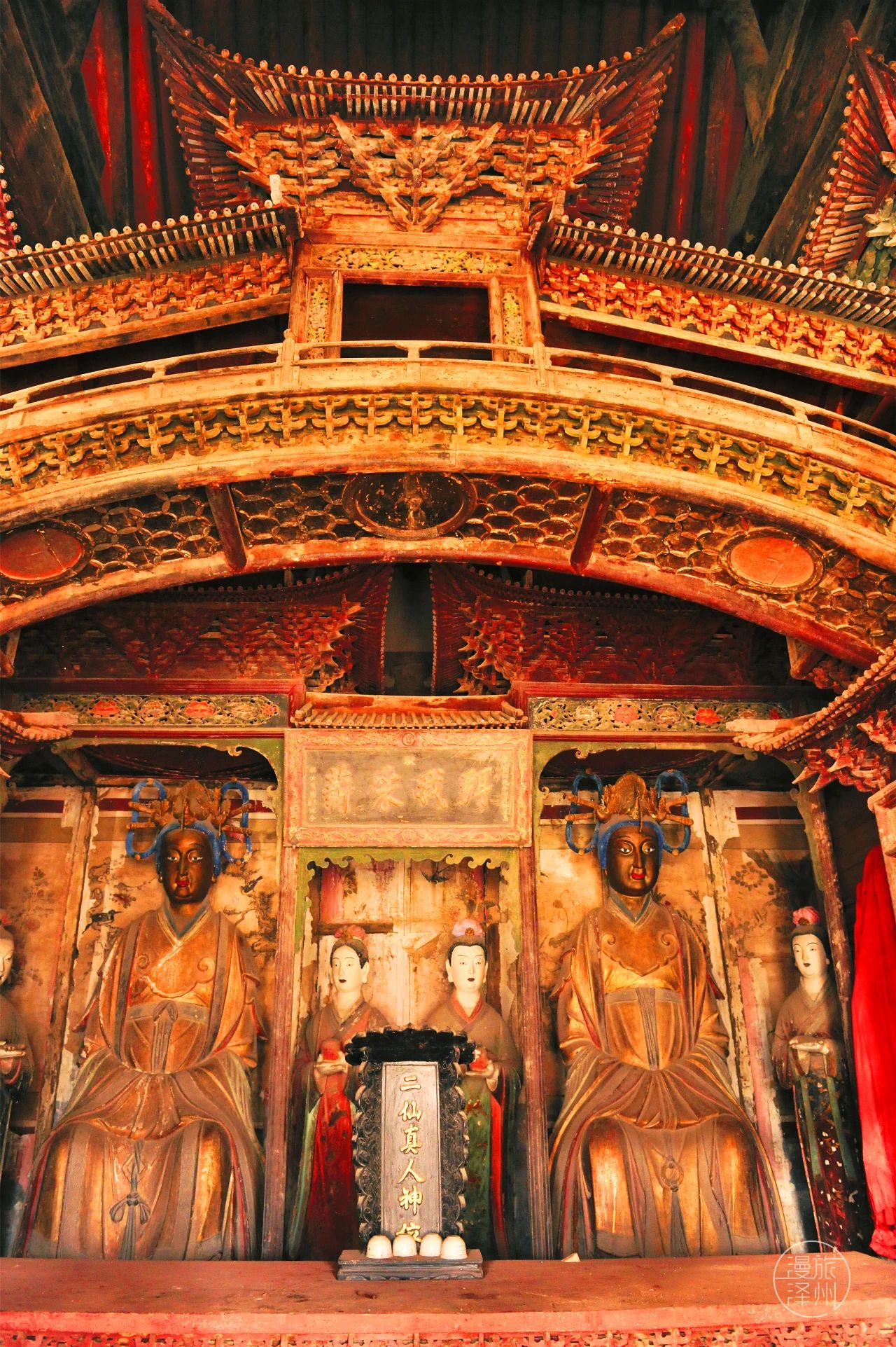 正殿内所塑“二仙”及胁侍、女官塑像共十六尊,所塑人物体态端庄,身材修长,表情丰富,生动传神,其衣裙色彩协调、线条流畅,堪称宋代泥塑之佳作,为研究宋代雕塑艺术提供了珍贵的实物资料。尤其是仙台上所塑二仙像,是晋东南地区最早出现的宋代彩塑,也是整个山西地区乃至全国唯一的一处宋塑乐氏二仙神像,具有极高的艺术造诣和研究价值,弥足珍贵。