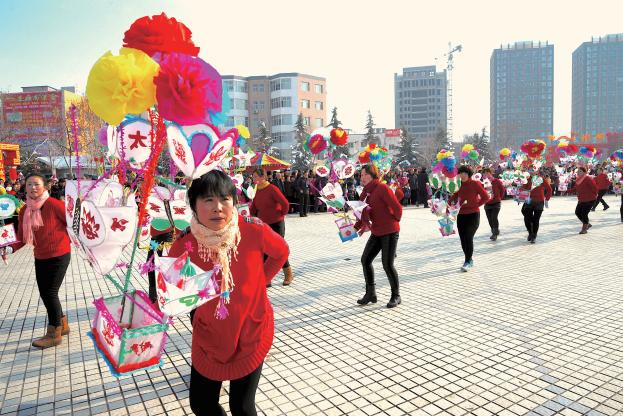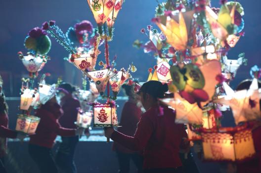 正是因为对美好生活的期许,冶底村的先民们不仅将莲花灯制成了伴舞道具,更是围绕它编排出了欢乐喜庆的节日舞蹈。身着艳丽服装的演员们手持莲花灯分两队场外站立,为首者为“王灯”,一手九灯,两手十八盏,其后有双手十六盏、十四盏……鞭炮暖场,音乐响起,演员们手举花灯以金蛇蜕皮式的套路快步跑场。在表演中,人移花舞,穿插交替,仿佛人入花海,又好似花涌人潮,观者赏心悦目,赞叹不已。在此过程中,演员们边演边唱,不时摆出庆祝吉祥的字样。