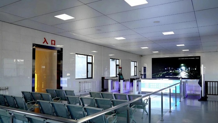 入井通道全长66米、宽4米、高3.2米,采用钢筋混凝土结构,将连队调度楼与副立井口紧密连接,形成一条全封闭、一体化的通行廊道。与其配套的等候室长23米、宽9米、高4.15米,空间开阔、布局合理,设置有多排舒适的等候座椅,配备的电子屏可用于岗前安全宣誓,还可播放安全事故案例、操作规程等警示教育视频,从形式到内容都实现了数字化、规范化升级。