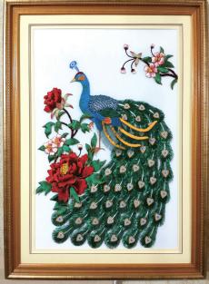 作品《竞艳》是传承人孙军伟的代表作,画中的孔雀用了1000多块布头,上下粘贴了8层,剪工细腻、层次分明、图像逼真,具有很鲜明的艺术特色。