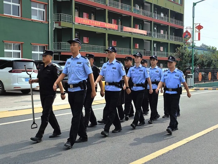 2024年9月10日,端氏派出所民辅警联合端氏煤矿保安进行治安巡逻,巡逻队伍身着制式服装,配备防暴钢叉等装备,沿企业周边道路有序行进