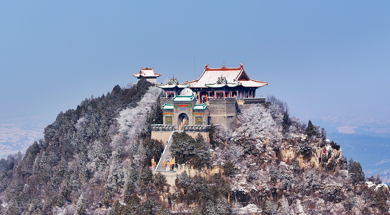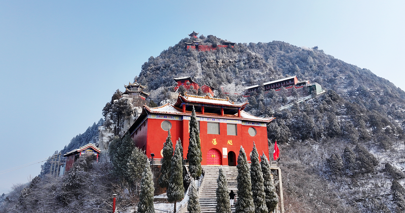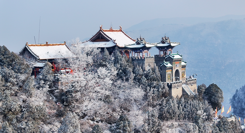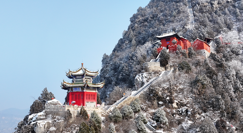 2025年12月31日下午,一场岁末降雪将“珏山”点缀,宛如水墨画卷。红墙黛瓦的古建筑群覆着皑皑白雪,山顶的飞檐在雾霭中若隐若现,石阶蜿蜒于琼枝玉树间,游客身临其境,宛如天上仙宫。(张少毅)