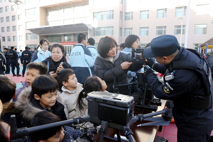 在装备展示区,警用无人机、安检排爆、防暴盾牌、对讲机等装备整齐陈列,瞬间吸引了孩子们的目光,大家兴奋地围在装备旁,专注地倾听民警辅警讲解,认真了解各类装备的用途和操作方法。