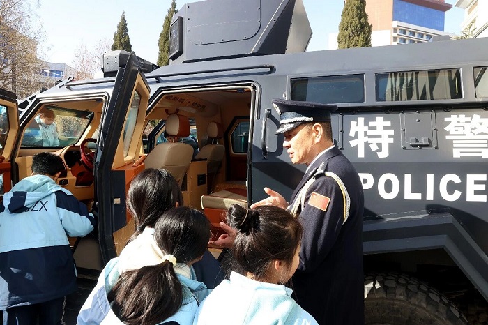 威风凛凛的水炮车、装甲车、霸气十足的武装巡逻车整齐列队,引得小朋友们争先恐后爬上车辆拍照留念,过了一把“小小警察瘾”。