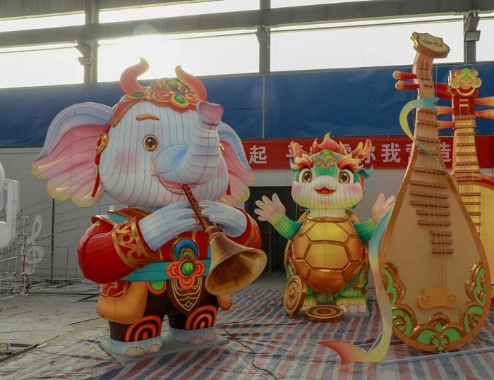 在制作环节,工人们动作娴熟地切割铁丝、焊接骨架、安装灯组、裱糊绸布,用巧手塑造着一盏盏花灯。今年该公司在推出马年主题花灯的基础上,还设计了兼具观赏性与文化性的高平非遗元素灯组。匠心设计的“八音吉乐”灯组,融入了高平八音会元素,造型各异的神兽分别手持唢呐、笙、锣、镲等传统乐器,以彩灯为载体,加装机械传动装置,灵动复刻了高平八音会的非遗技艺。