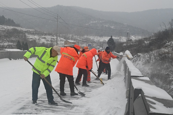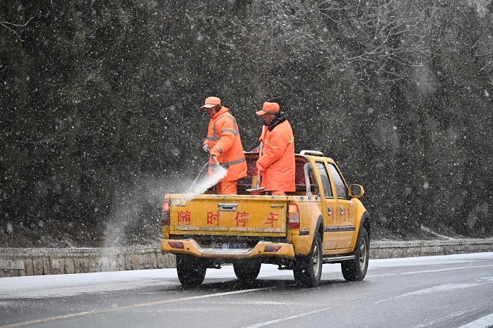 除雪机械轰鸣,在主干道上开辟通道;身着橙色工装的养护人员紧随其后,对桥梁、弯道、路肩等机械盲区进行精细化清理。同时,根据雪情变化,分时段精准撒布融雪剂和防滑料,有效防止了路面结冰。