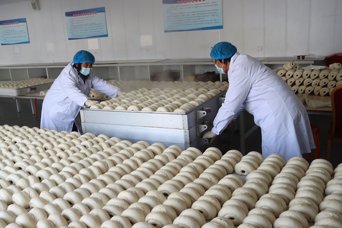 人间烟火处,年味正浓时。1月25日,位于阳城县北留镇坨村的阳城县鑫时泰商贸有限公司传统手工泡麦面馍生产基地内,麦香萦绕、人影攒动。工人们指尖翻飞,从揉面、塑形到泛馍、蒸制,一道道工序有条不紊,以坚守百年的匠心手艺赶制泡麦面馍,全力供应新春市场,让这份承载着近500年历史的非遗味道,香飘千家万户。
