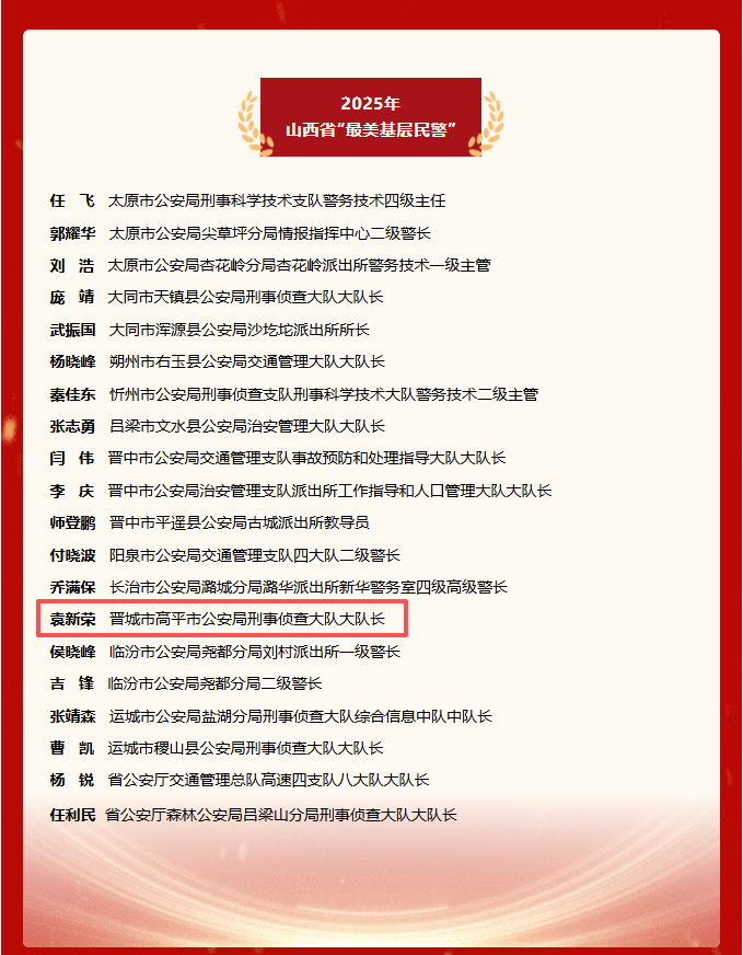 近日,中共山西省委宣传部、山西省公安厅向社会发布2025年山西省“最美基层民警”,20名同志光荣入选2025年山西省“最美基层民警”。其中,高平市公安局刑事侦查大队大队长袁新荣上榜。