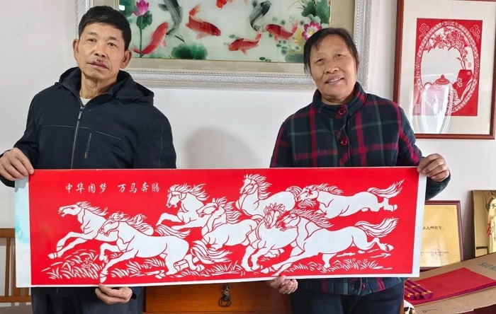 在米西村,市级非遗代表性传承人姬秀琴老师精心准备了一幅题为“万马奔腾”的大型剪纸作品,准备亮相即将开幕的民间艺术展。这幅作品不仅展现了高超的剪纸技艺,更融入了她对传统艺术现代表达的思考与实践。在她的手中,传统非遗不再是博物馆里的静态展示,而是充满当代意识的“活态传承”。