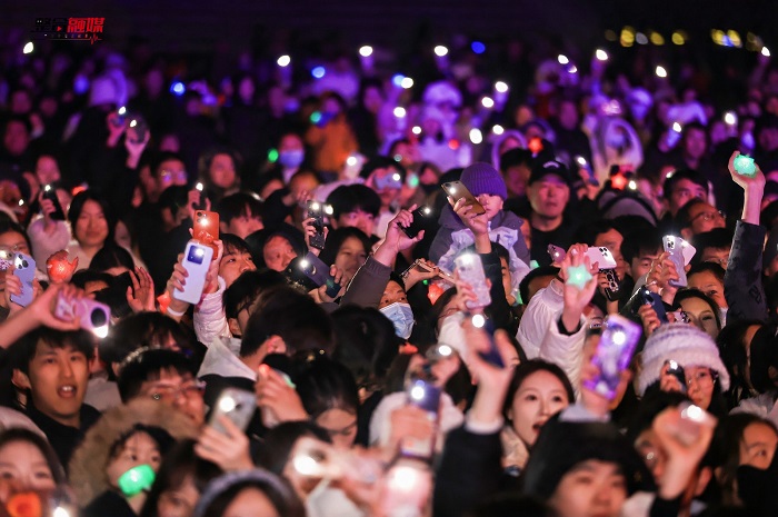 现场最令人印象深刻的时刻,莫过于近万名年轻人、大学生同时举起双手,随着音乐的节奏舞动,那一刻,他们手腕上戴着的腕灯,汇聚在一起仿佛流动的星海。