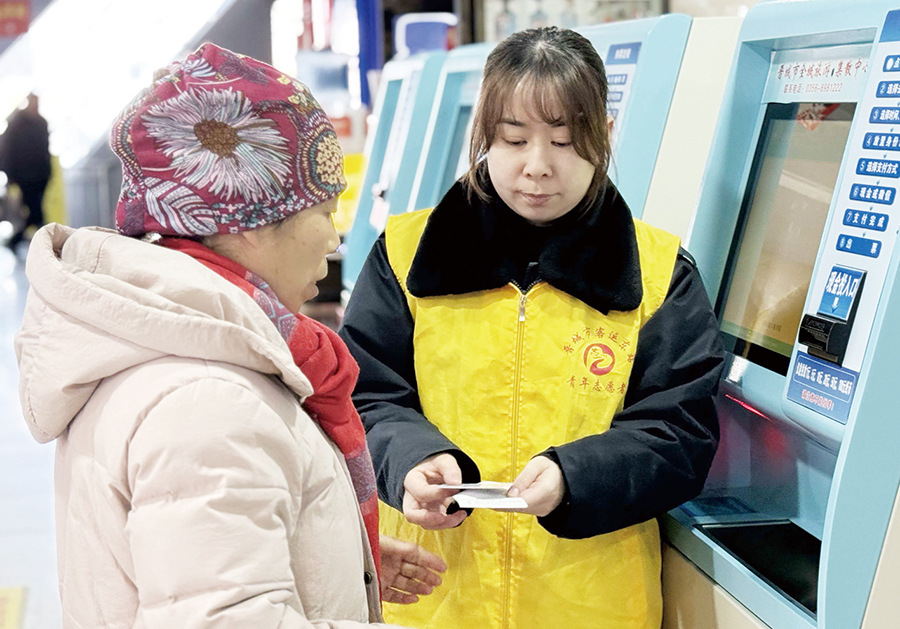 晋城市客运东站的志愿者正在帮助乘客购买车票。芦慧青 摄