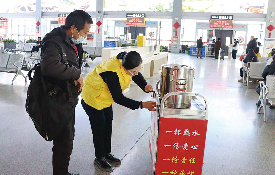 在晋城市客运东站,志愿者正在帮旅客接热水。 芦慧青 摄