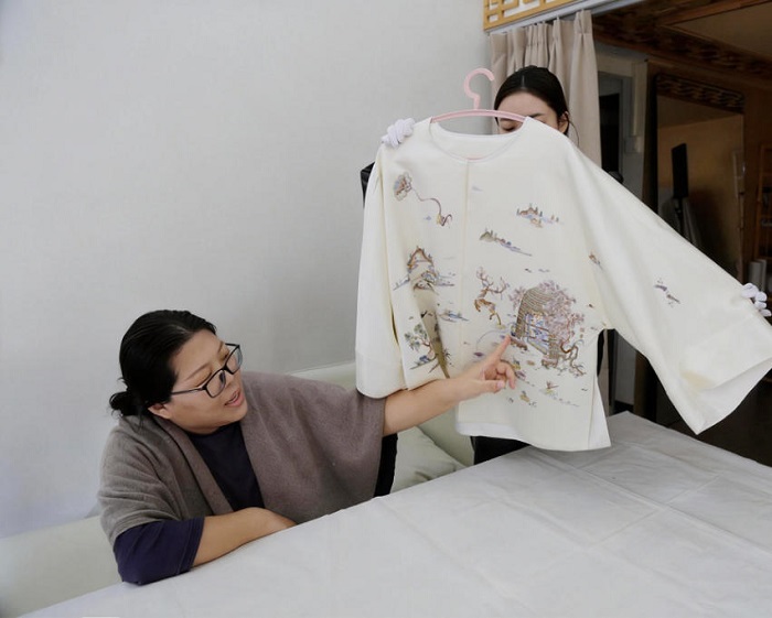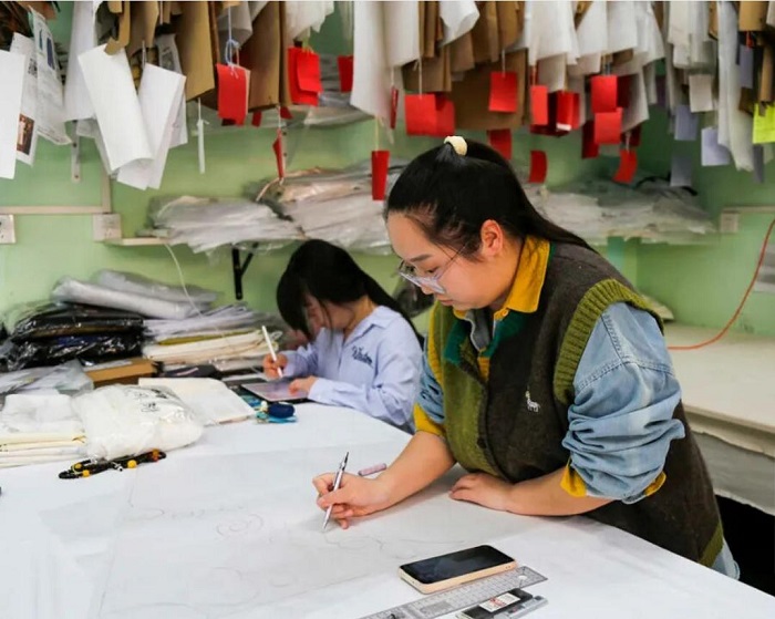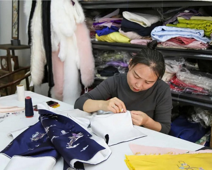手工坊负责人郭晓杰说:“一件衣服的诞生,前后要经历设计、选料、刺绣、缝制等数道工序,每一步都是对审美的考验。”