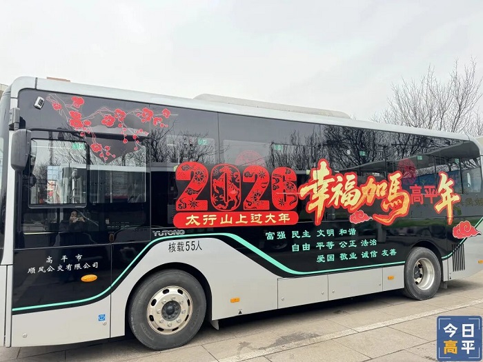 在神农客运中心,一辆辆装饰一新的公交车格外吸睛,车身张贴着“2026幸福加马高平年”“高妈欢迎您回家过年”等暖心标语,字里行间满是归家的温情与新春的期许。走进车厢,红彤彤的“福”字环绕车顶,扶手上挂满精巧的马年主题卡片,还有“高平第四届炎帝灯会”的装饰点缀其间,年味扑面而来。目前,40辆新春主题公交车已投放在401、402路及6路等主干线路,途经市区及高铁站。